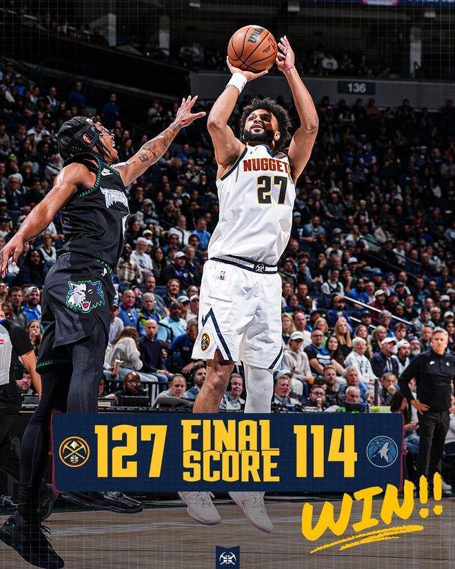 末节决战,森林狼连续冲击篮下,并一度将分差缩小至3分。但是约基奇、穆雷联手得分,稳住了局面。沃特森外线发难,还送出大帽,掘金重新取得15分领先,得以锁定胜局。明尼苏达远投命中率下滑,追分乏力,比赛逐渐失去了悬念。最终,掘金以127比114完胜对手,就此斩获2连胜。